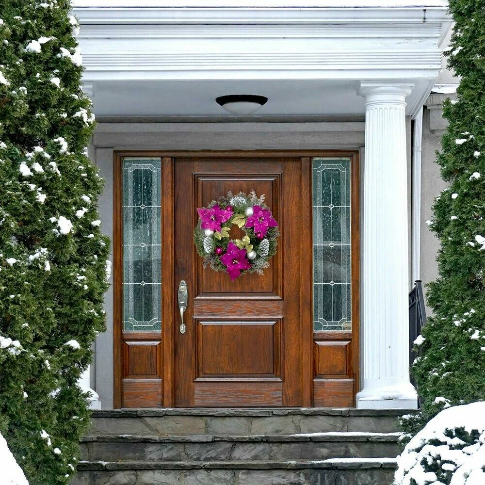 Spruce up your holiday decor with a 24-inch round artificial wreath from Fraser Hill Farm. Whether you deck the halls indoors or outdoors, invest in a quality wreath that will last year after year. This wreath features vibrantly-hued poinsettias with pinecones and ornaments scattered throughout. The arrangement creates a complete look with subtle touches of Christmas symbols. This wreath is coveted for its delightful arrangement of realistic branches, rustic charm, and festive accents to complete the look. Hang this wreath on your door and greet each guest with holiday cheer that will last from one season to the next.