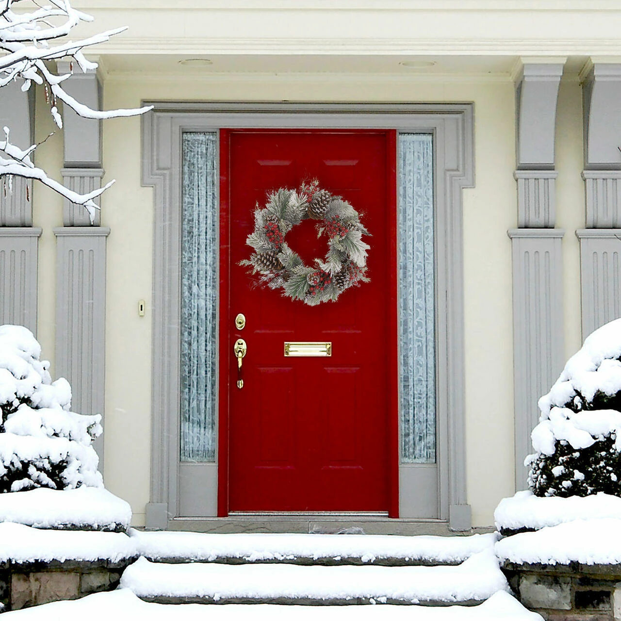 - Durable faux foliage and real twigs accented with artificial red berries and real pinecones