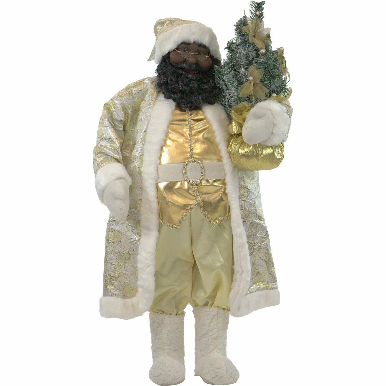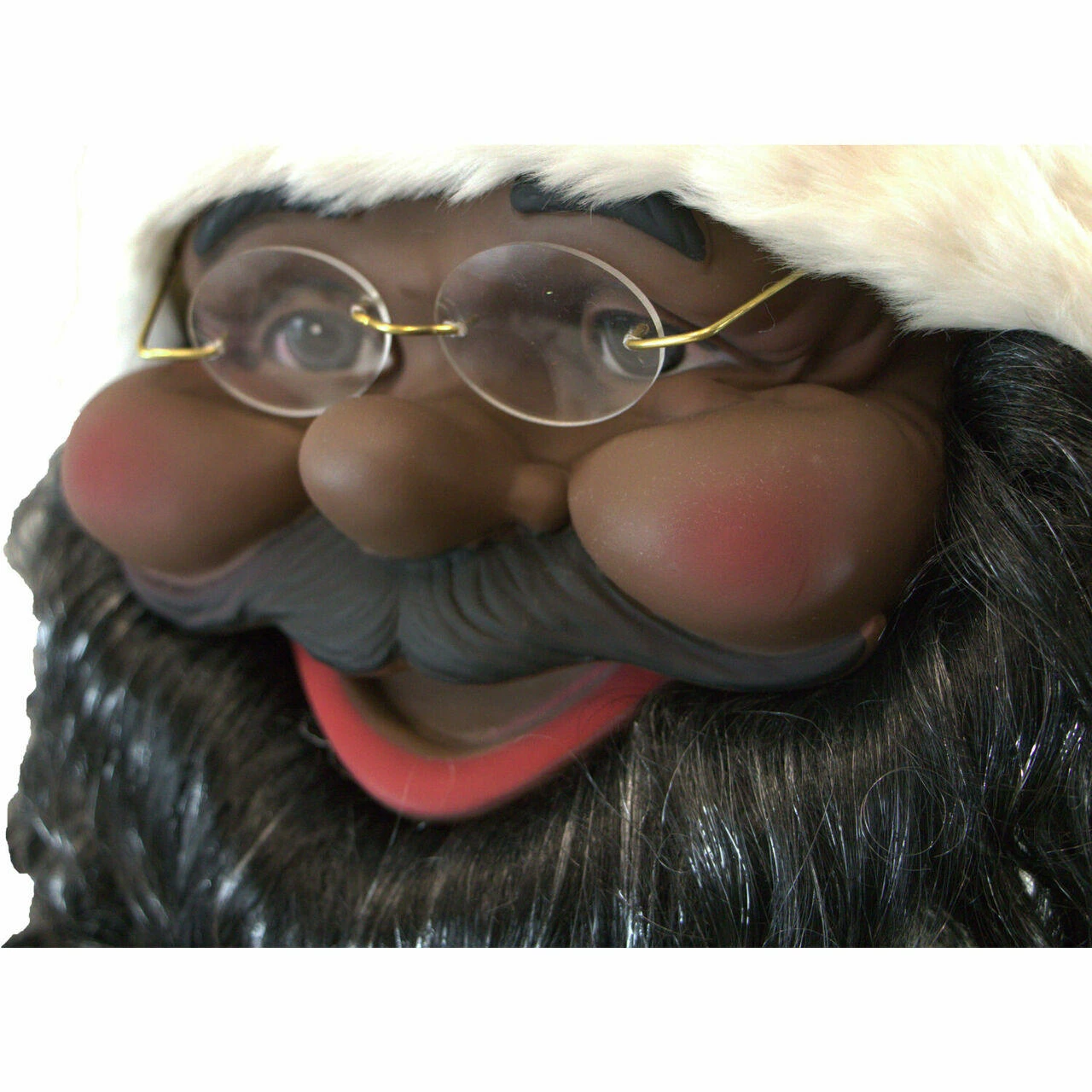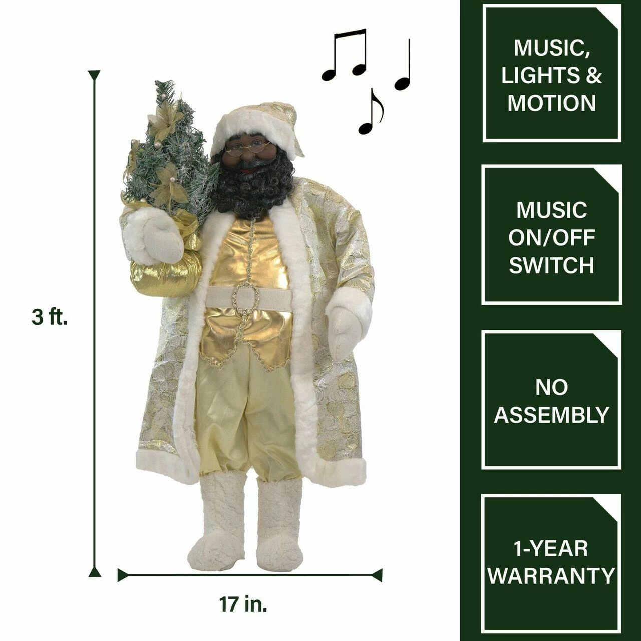 - 36-in. Music and Motion African American Santa moves his head and arms while holding a lighted Christmas tree