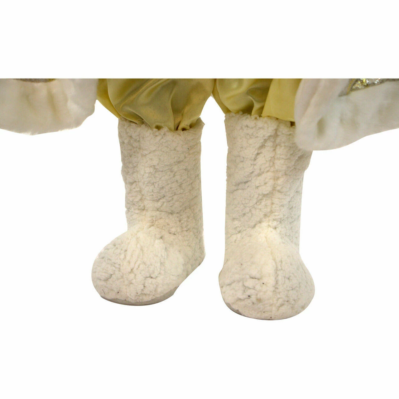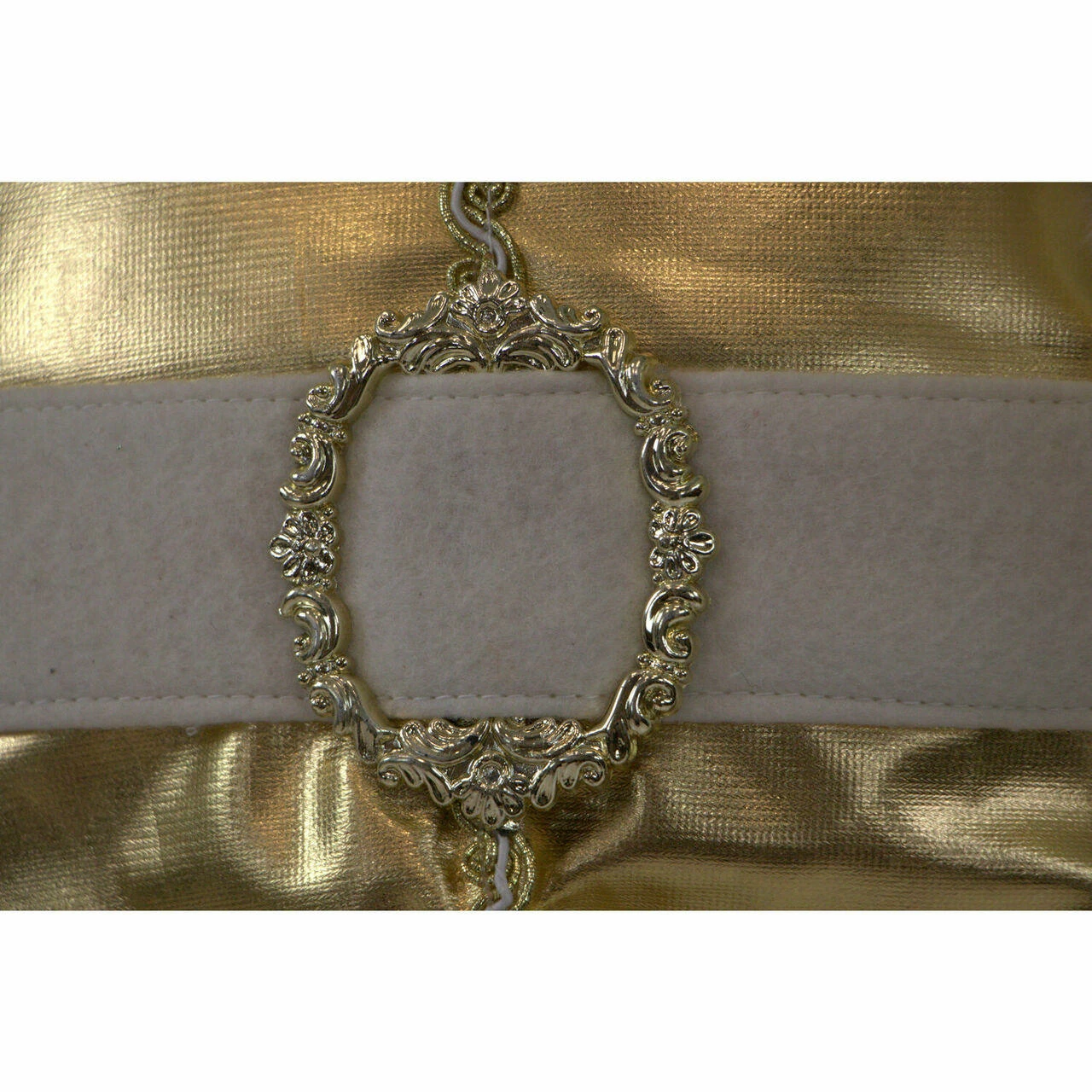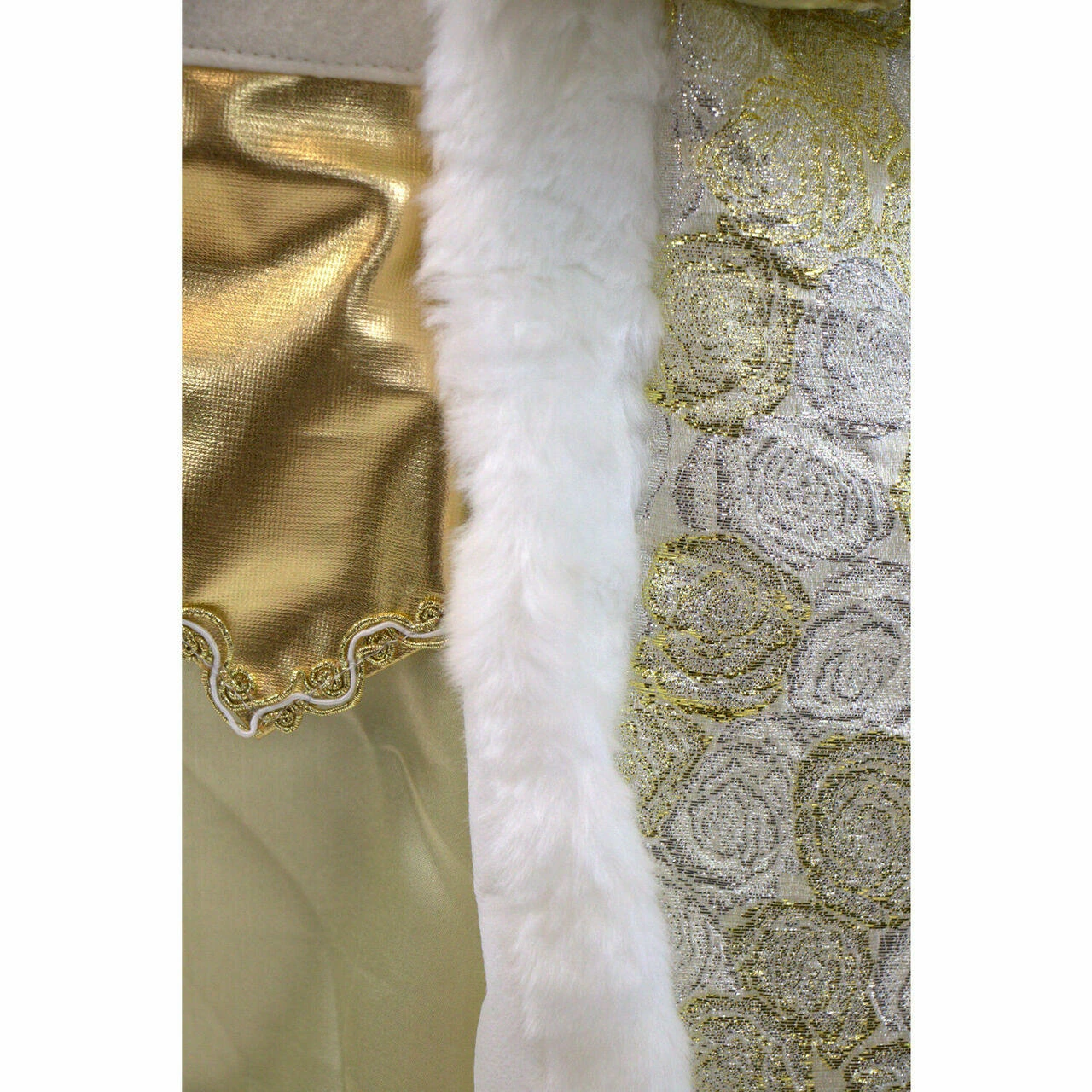 - Elegantly dressed in a golden velvet coat with furry white trim over a golden satin suit