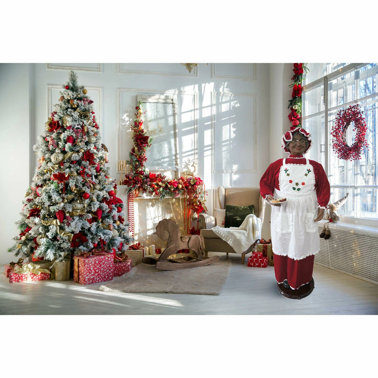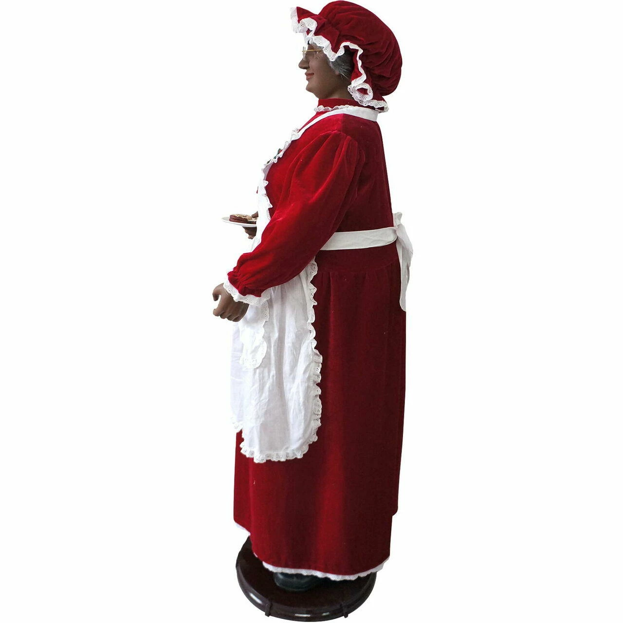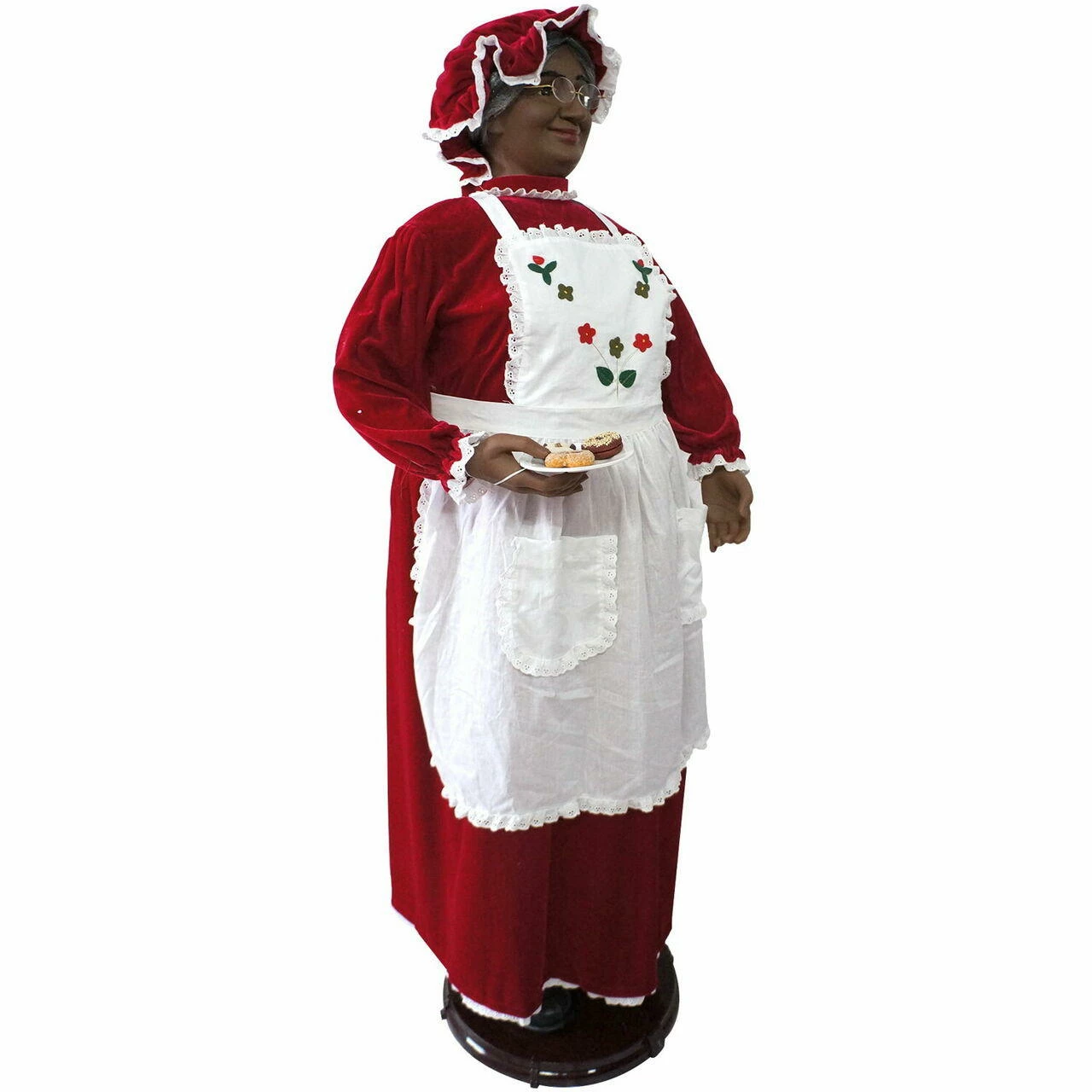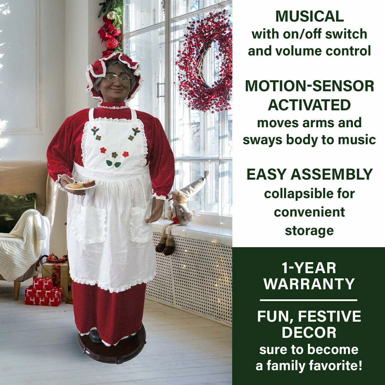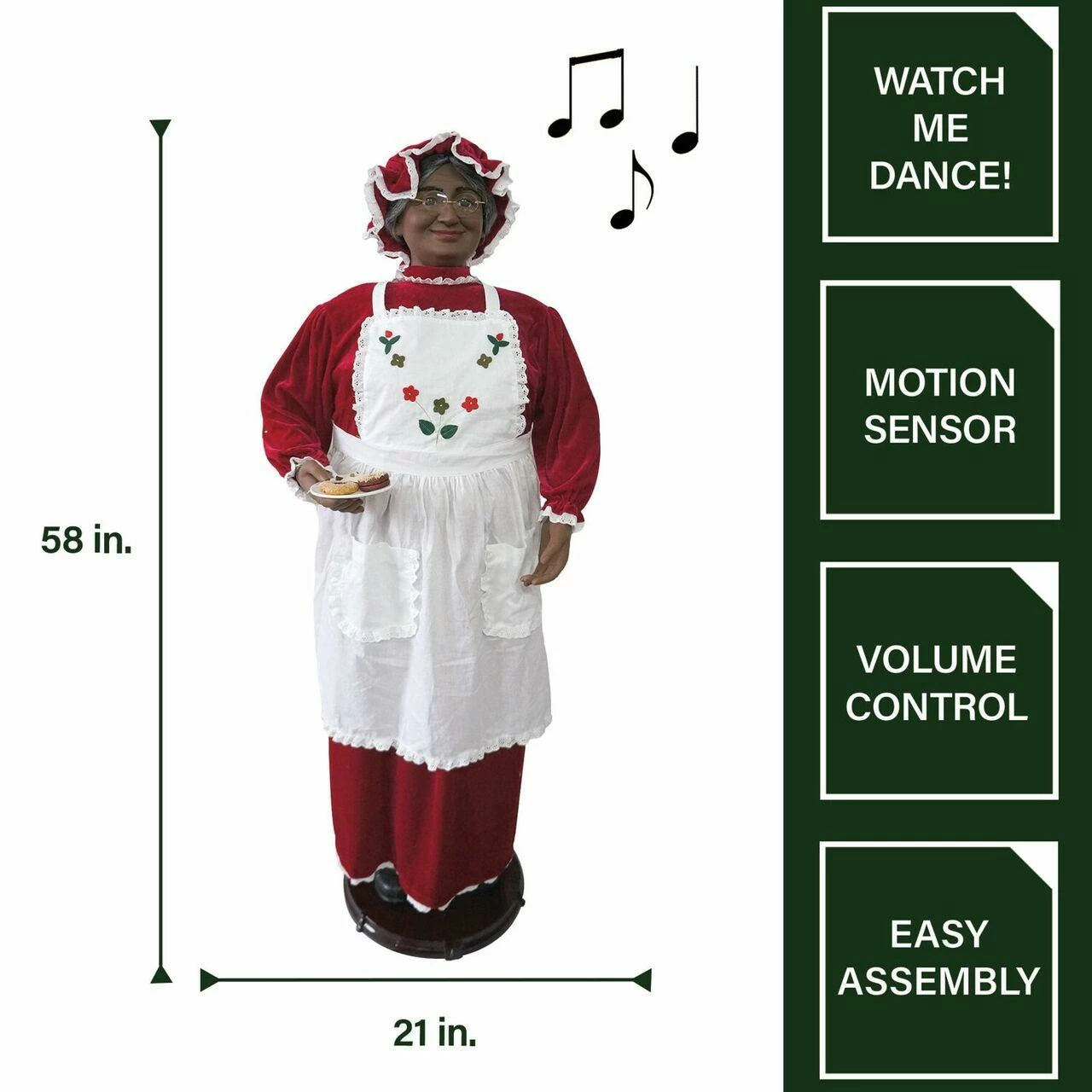 - 58-in. motion-activated dancing African American Mrs. Claus with apron, mob-cap, and a plate of Christmas cookies