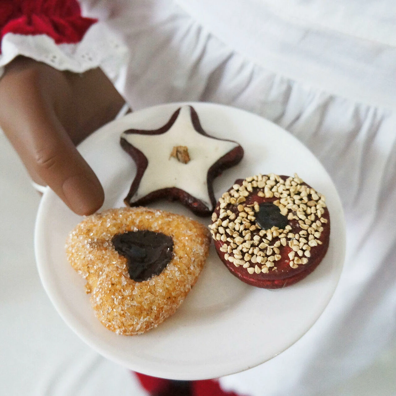 - Red velvet dress with white eyelet trim and coordinating mob-cap completes her festive style