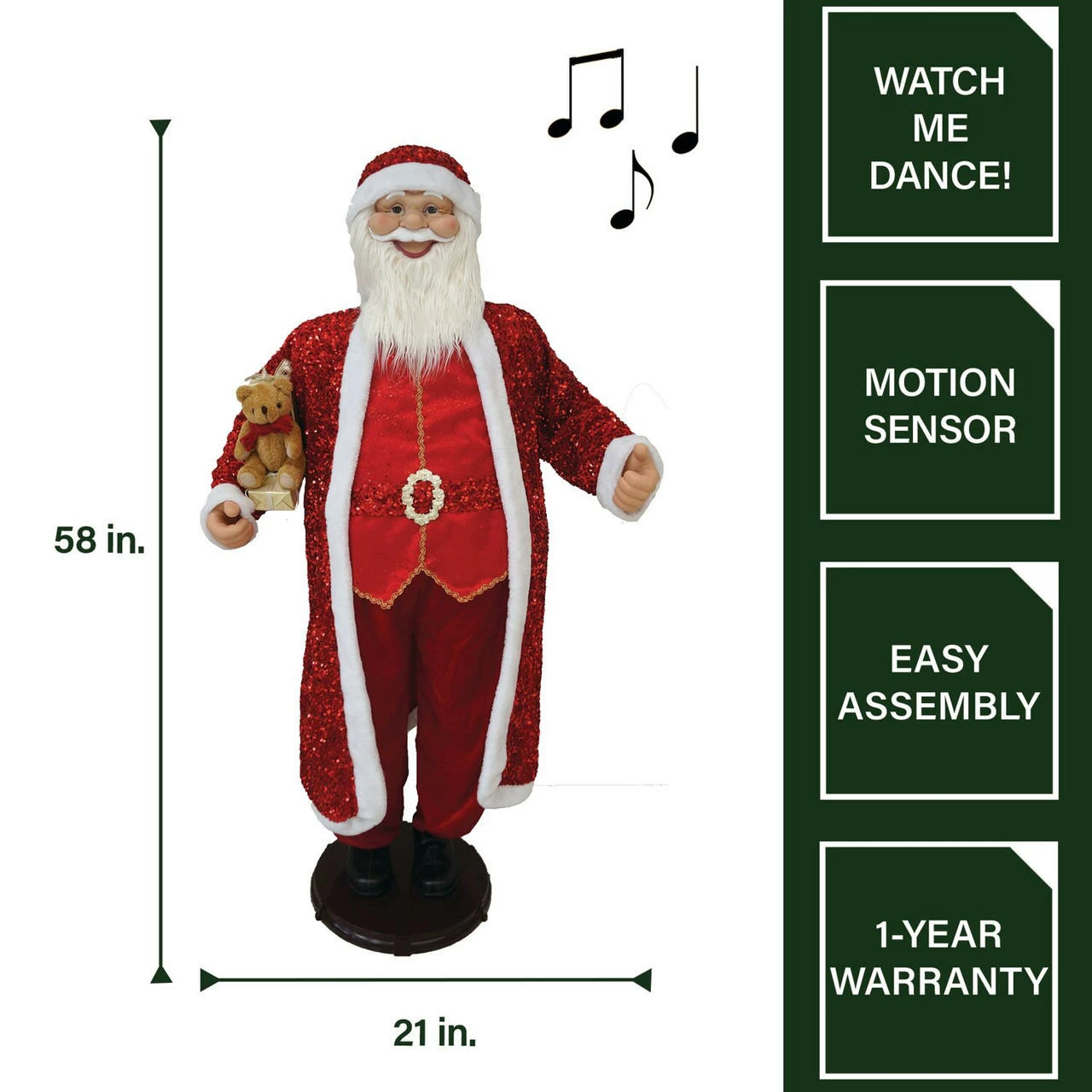I saw mommy dancing with Santa Claus! Our dancing Santa from Fraser Hill Farm will have everyone dancing and spreading holiday cheer. Standing 58 inches tall, Dancing Santa carries a teddy bear sitting on wrapped gifts. When motion is detected, he will move his arms and sway his body to the song Jingle Bell Rock. Dressed in his fancy red sequin suit, Santa’s friendly face with open spectacles, round chubby cheeks, and a full beard will warm your heart. Place him in the foyer, near the fireplace, or next to the family Christmas tree, and watch as everyone starts dancing.