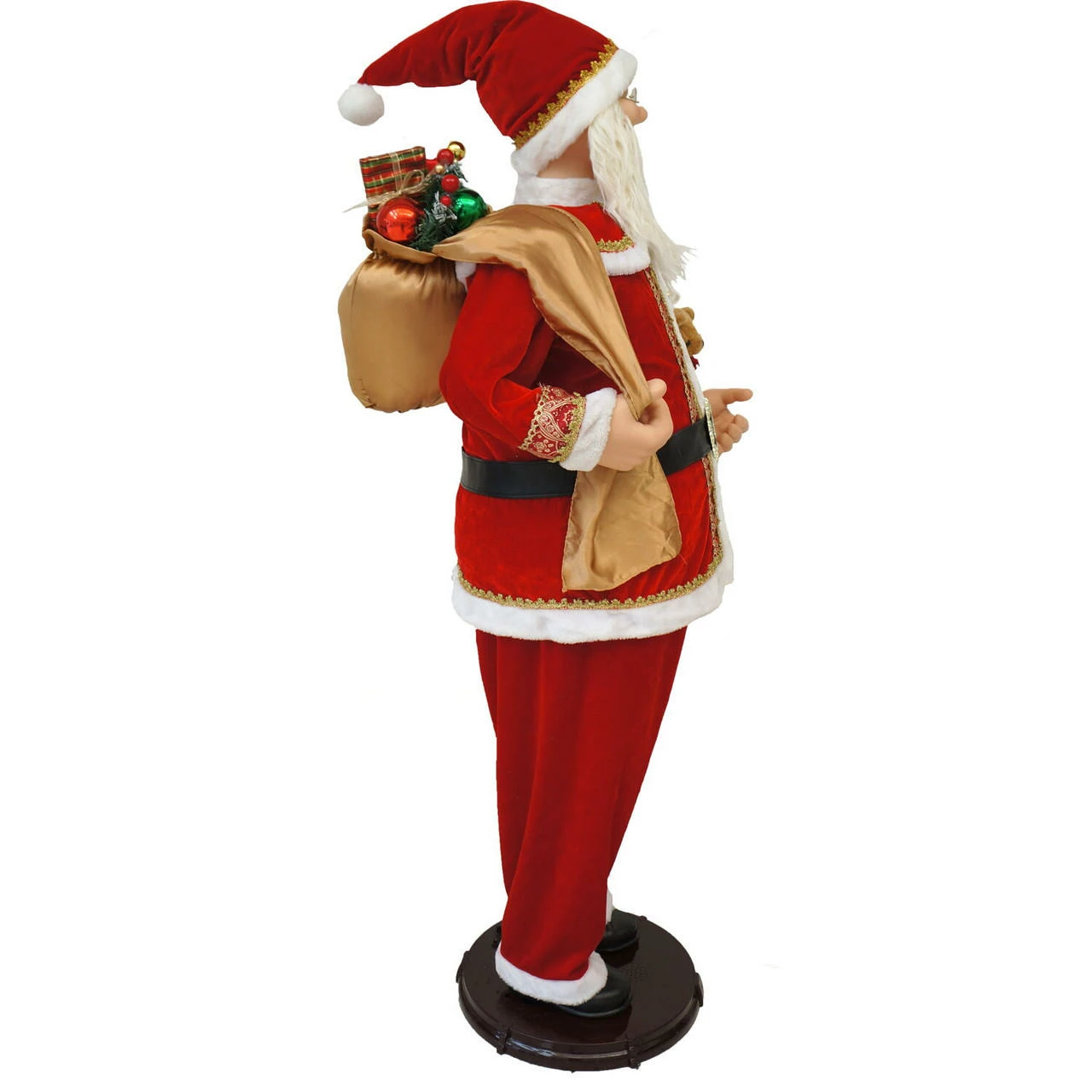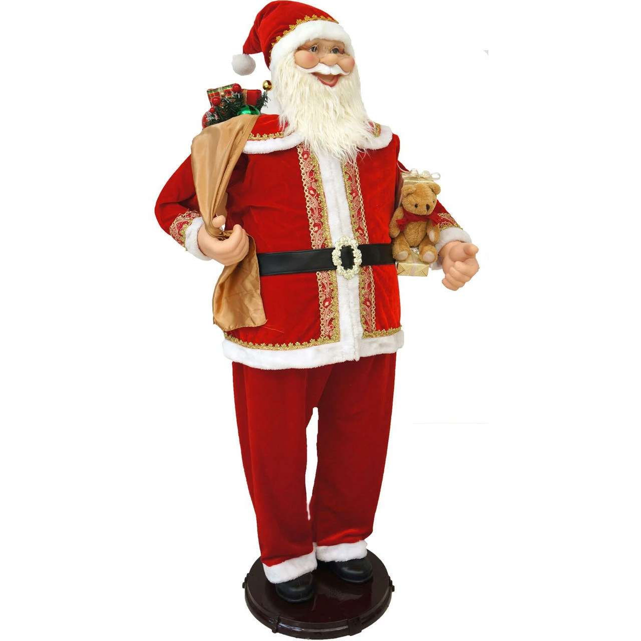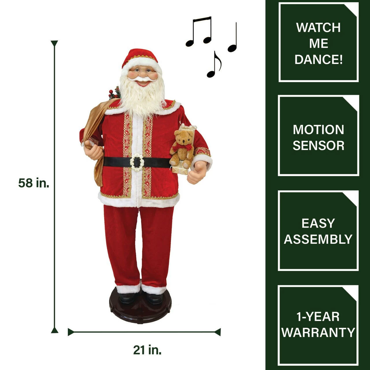 - 58-in. motion-activated dancing Santa carries his toy sack and a teddy bear sitting on wrapped gifts
