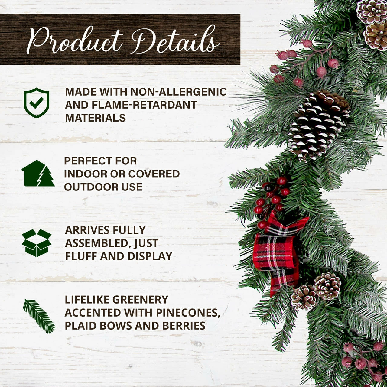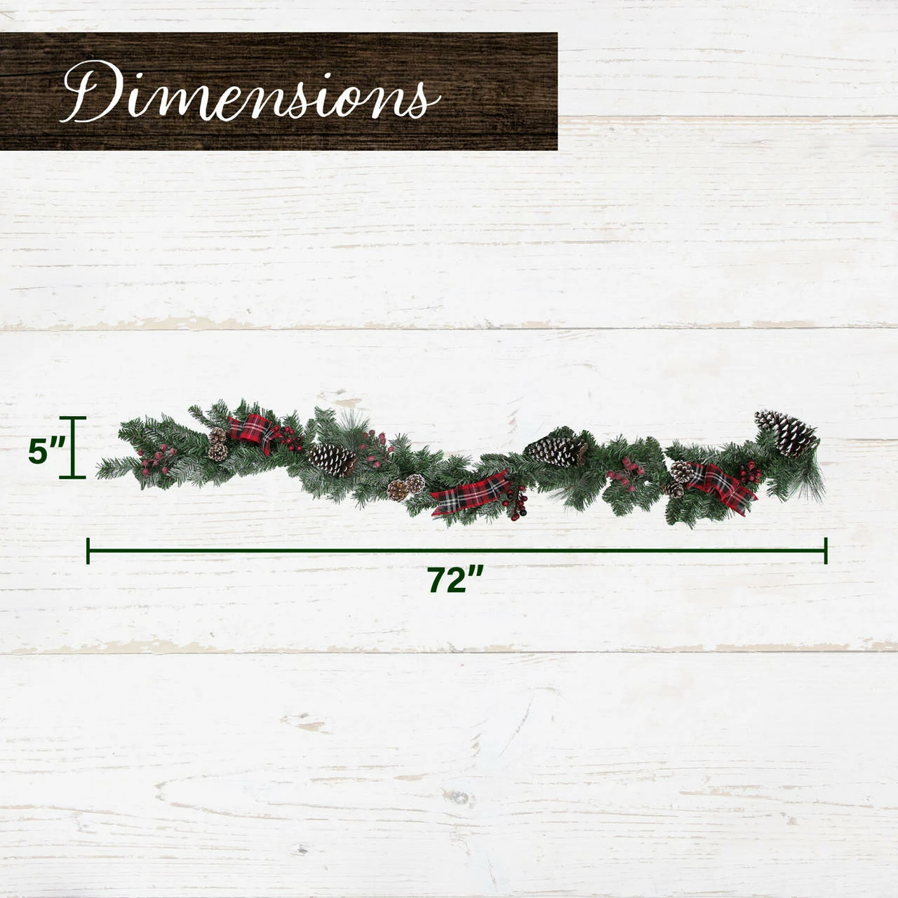 Spruce up your holiday decor with a 6-foot artificial garland from Fraser Hill Farm. Whether you deck the halls indoors or outdoors, invest in quality decor that will last year after year. This garland features a mix of realistic pine branches with oversized pinecones, red plaid bows and red berries scattered throughout. A light dusting of flocked snow glistens among the wispy branches and accentuates the details beautifully. This garland is coveted for its delightful arrangement of realistic branches, rustic charm, and festive accents to complete the look. Wrap this garland around a railing, drape it over a mantel or anywhere else you see fit and spread holiday cheer that will last from one season to the next.