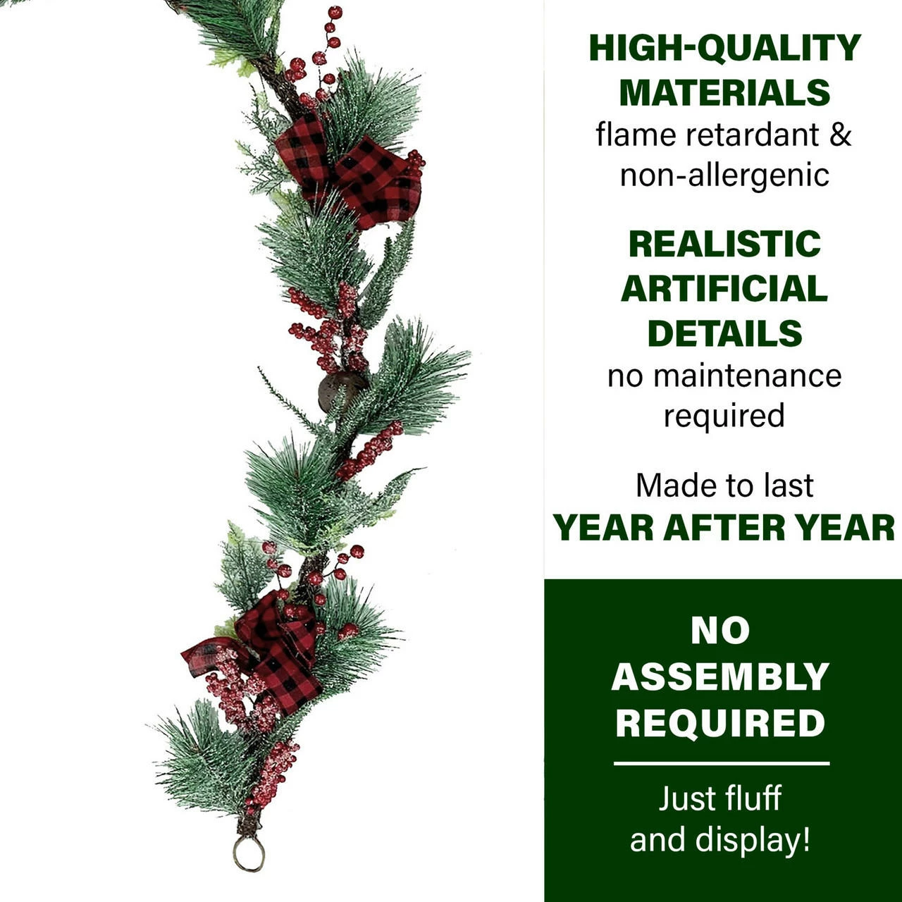 Spruce up your holiday decor with a 9-foot artificial garland from Fraser Hill Farm. Whether you deck the halls indoors or outdoors, invest in quality decor that will last year after year. This garland features a mix of realistic pine greenery, red berries, plaid bows and rustic sleigh bells. The arrangement creates a complete look while evoking subtle feelings of Christmas. This garland is coveted for its delightful arrangement of realistic branches, farmhouse charm, and festive accents to complete the look. Wrap this garland around a railing, drape it over a mantel or anywhere else you see fit and spread holiday cheer that will last from one season to the next.