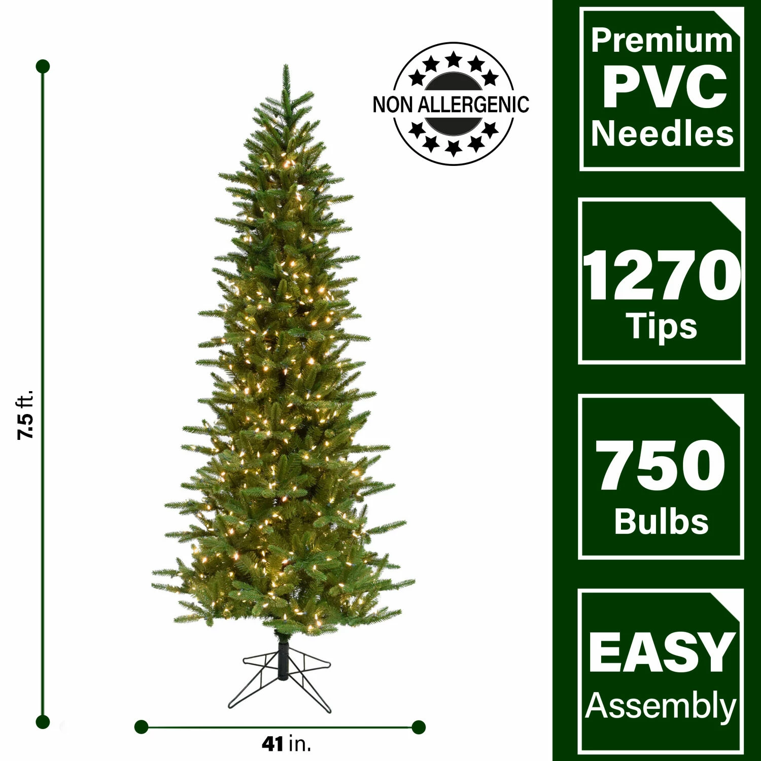 Our Carmel Pine artificial Christmas tree features a trendy slim silhouette, lifelike foliage, and an all-metal hinged branch construction for strength and durability. Its trendy slender form is perfect for small rooms, apartments, and any other area where space is limited. This model is specially crafted using the finest materials to not only look realistic, but to provide you with many seasons of use and enjoyment as well. The tree needles are constructed out of non-allergenic and flame-retardant materials then painted multiple hues of green so no two are exactly alike. With Fraser Hill Farm, enjoy all the long-term benefits that come with owning an artificial tree. Imagine never having to shop, chop, and pay for another natural tree again. With the Carmel Pine Christmas Tree, simply unfold out of storage and decorate!