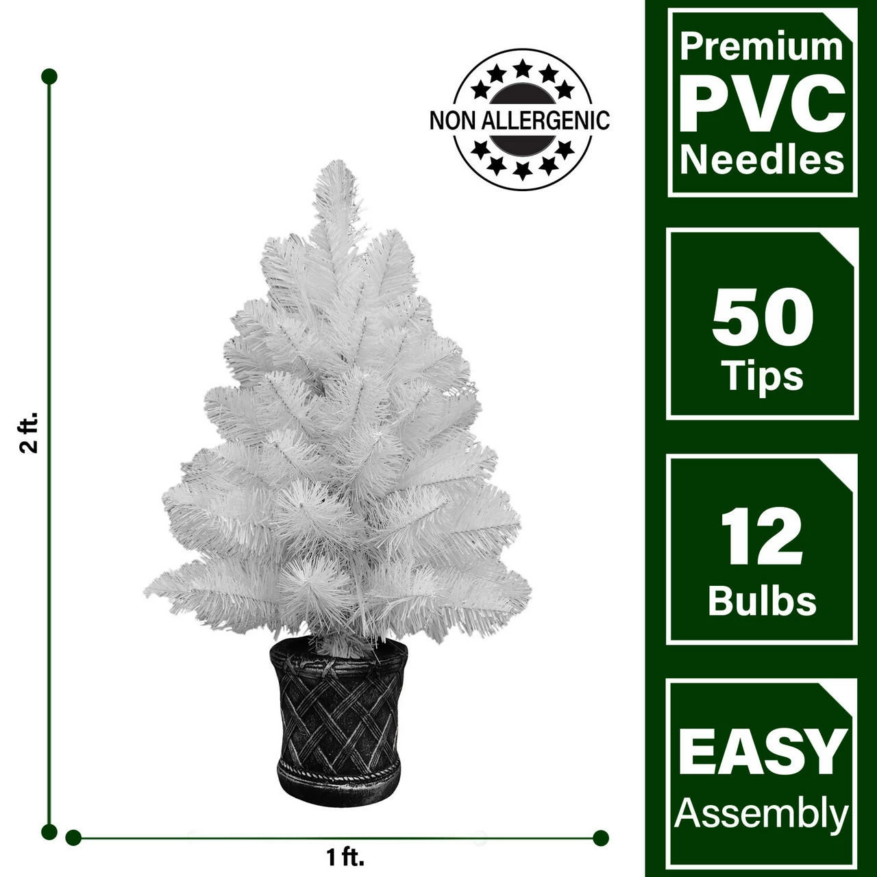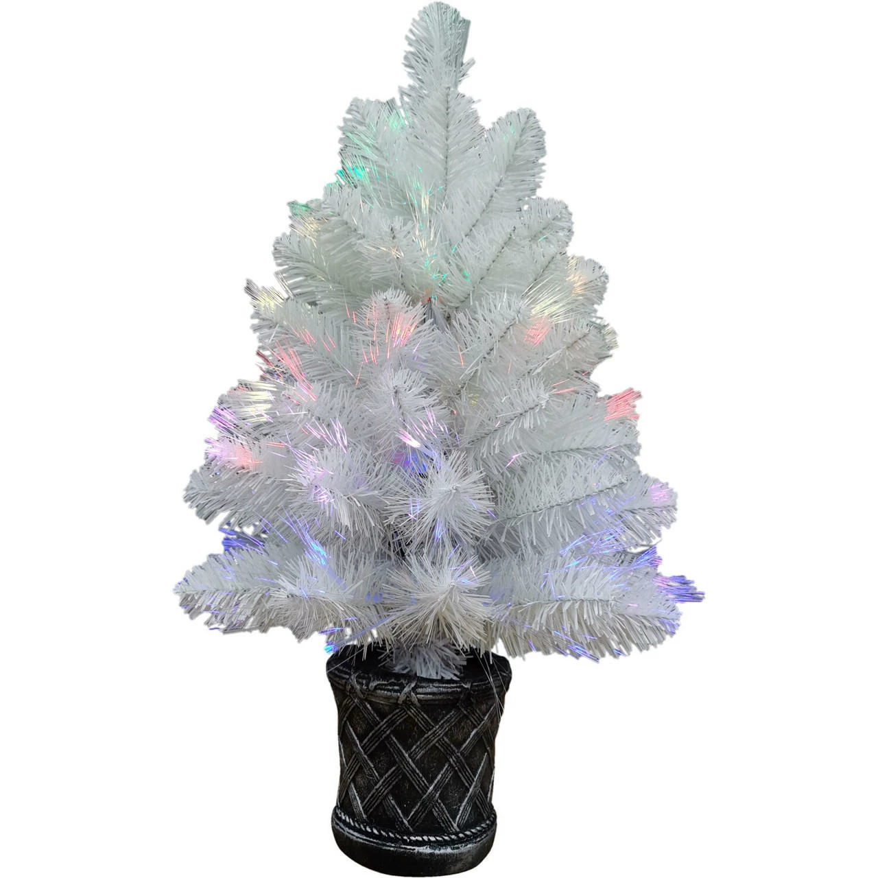 - 2-ft. tall white fiber optic tree in a cross hatched decorative pot ‘? ideal size for tabletop