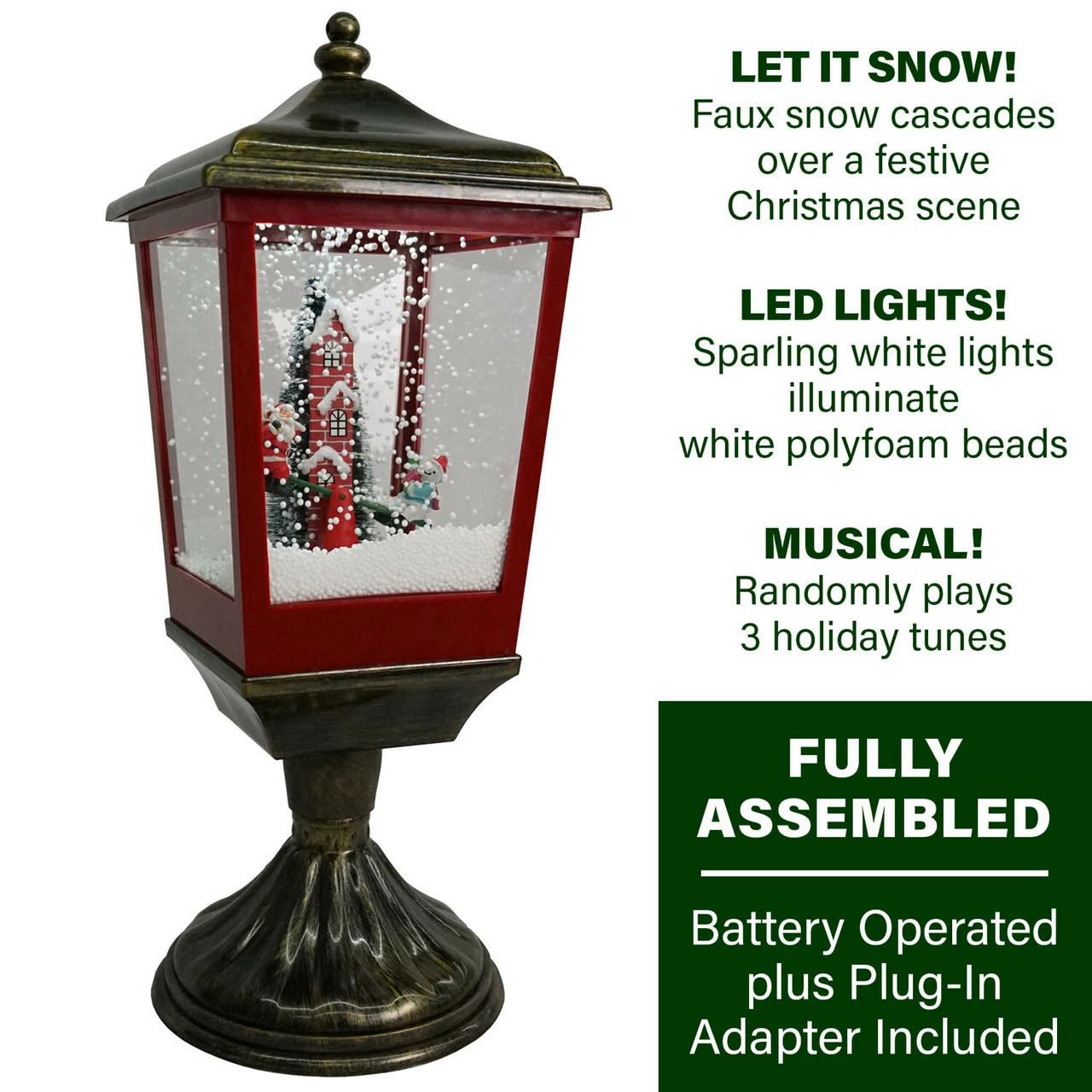 Capture the magic of falling snow with this 20.5-inch musical tabletop lamp from the Let It Snow series by Fraser Hill Farm, where all products produce flurries of faux snow that fall over various holiday scenes. Sparkling white LED lights illuminate the polyfoam beads cascading over Santa and a snowman on a seesaw. Three popular Christmas tunes (Jingleย Bells, Weย Wishย Youย aย Merryย Christmas, and Oh!ย Christmasย Tree) play randomly while the artificial snow flutters inside the lantern. You can enjoy the lights and snowfall with or without music. This snowy lantern on a pedestal will help create a magical winter wonderland on your fireplace mantel or holiday display table. Plug it in or use 3 AA batteries, then let it snow!