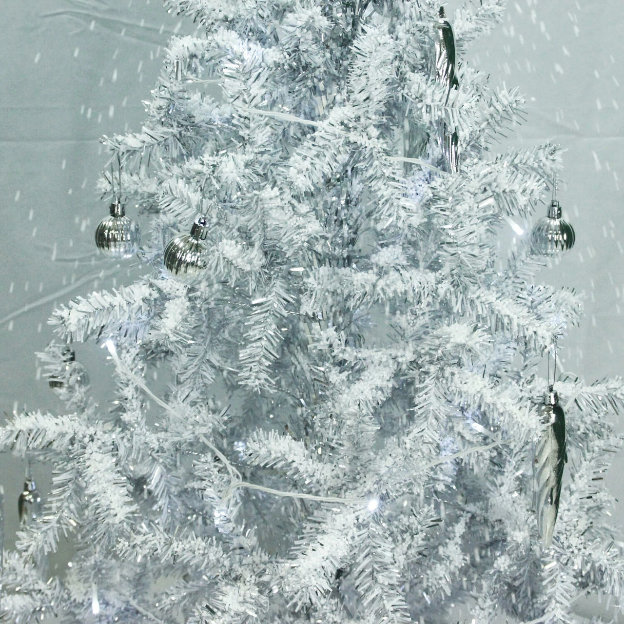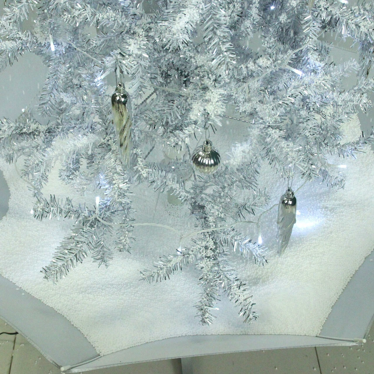 - A flurry of polyfoam beads resembling snowfall discharge from top of tree
