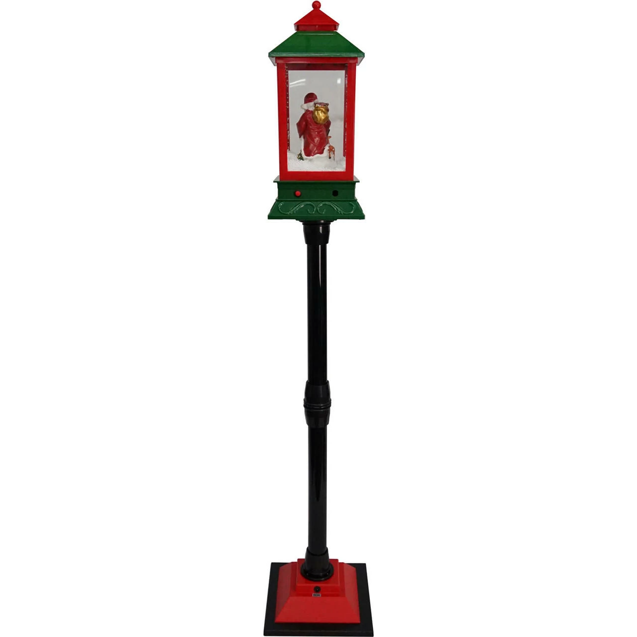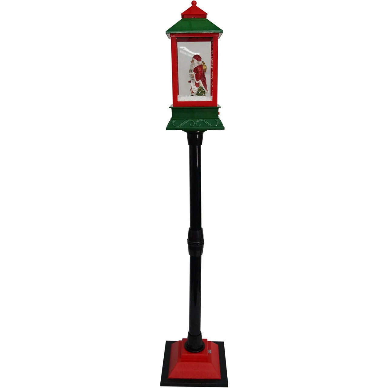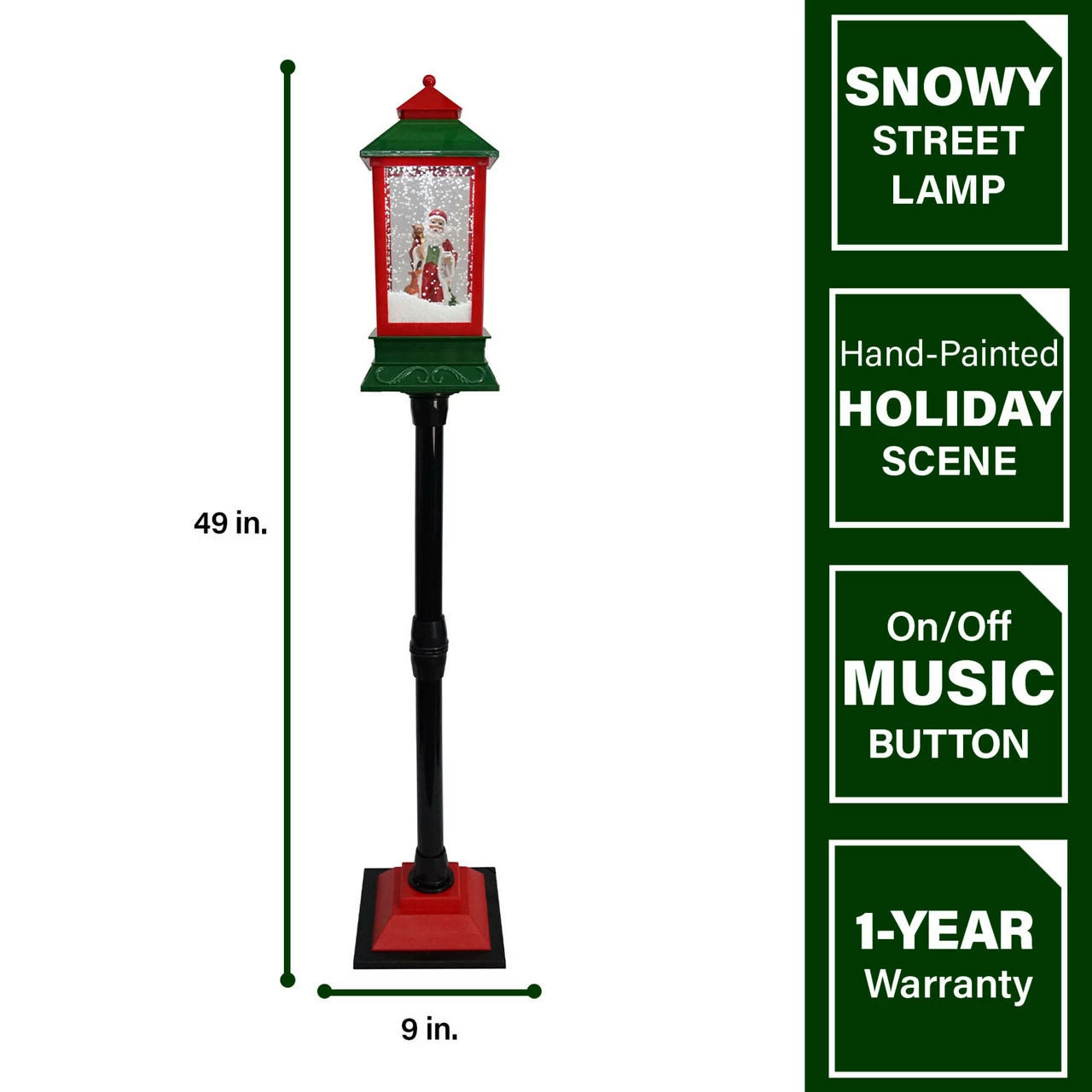 Capture the magic of falling snow with this 49-inch musical mini street lamp from the Let It Snow series by Fraser Hill Farm, where all products produce flurries of faux snow that fall over various holiday scenes. Sparkling white LED lights illuminate the polyfoam beads cascading over Santa Claus. Three popular Christmas tunes (Jingleย Bells, Weย Wishย Youย aย Merryย Christmas, and Oh!ย Christmasย Tree) play randomly while the artificial snow flutters inside the lantern. You can enjoy the lights and snowfall with or without music. This unique snowy lamp post will help create a magical winter wonderland on your covered porch near the doorway or anywhere inside your beautiful home. Plug it in, and let it snow, let it snow, let it snow!