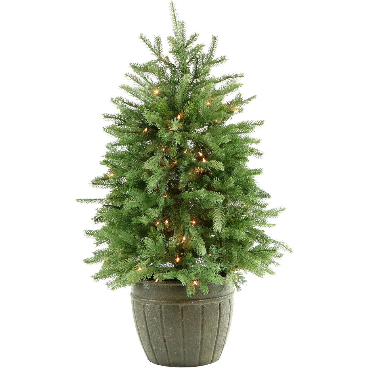 The 4-ft. Potted Pine Artificial Christmas Tree from Fraser Hill Farm features lifelike foliage and all-metal hinged branch construction. Fraser Hill Farm produces the most realistic trees in the market, featuring all the long-term benefits that come with owning an artificial tree. The tree simply unfolds out of storage ready to bring seasonal enchantment to your home. This model is pre-strung with a system of 100 evenly distributed, clear bulbs. The tree needles are constructed out of non-allergenic and flame-retardant materials then painted multiple hues of green so no two are exactly alike. These details create the look of a natural tree and require less maintenance. Designed to last, this 4-ft. potted Pine tree is sure to provide more convenience and ease to your holiday season, year after year.
