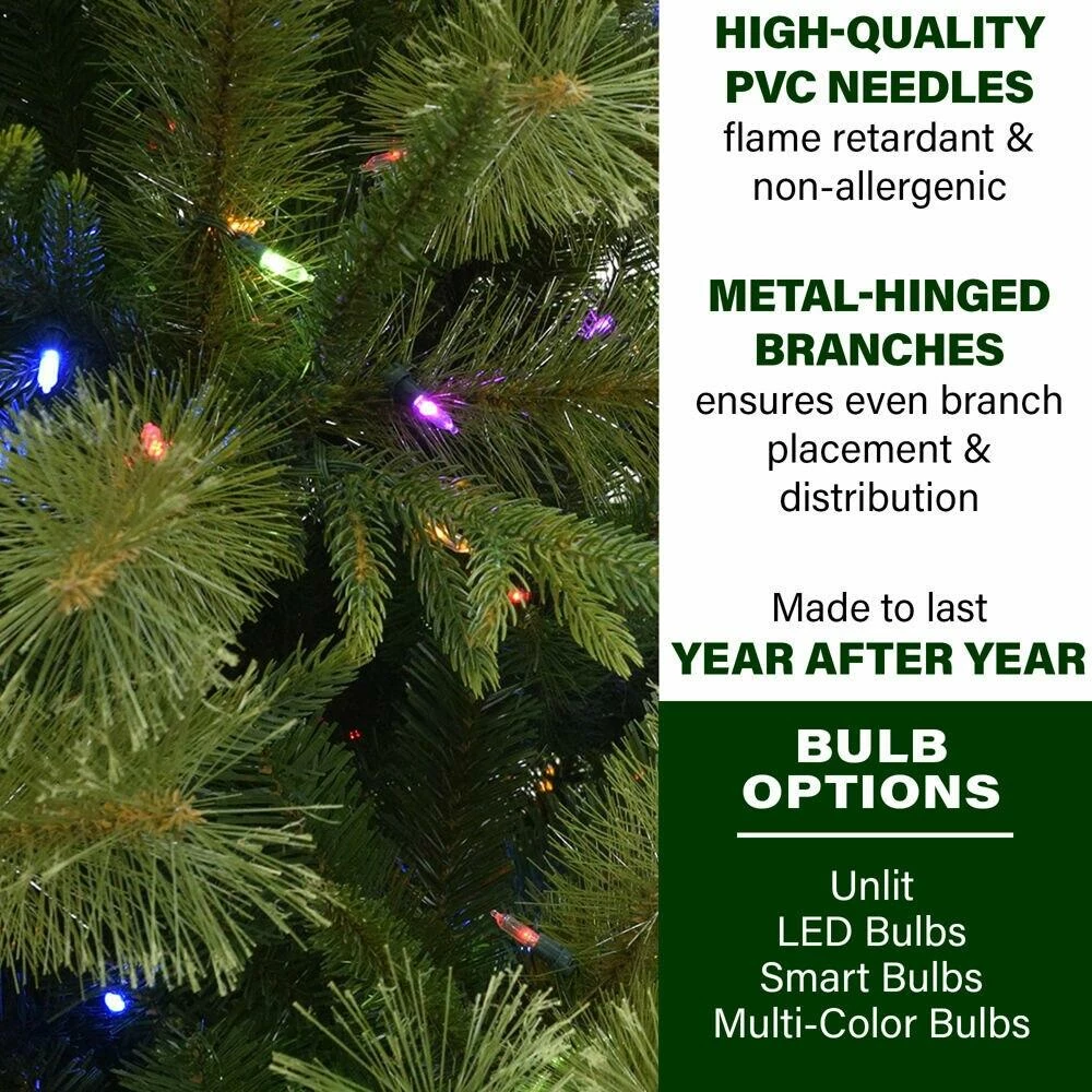 Victoria Pine Green Christmas Tree artificial Christmas tree from Fraser Hill Farm features a full natural silhouette with extremely lifelike and all-metal hinged branch construction. Imagine never having to shop, chop and pay for another natural tree again. Fraser Hill Farm produces the most realistic trees on the market, featuring all the long-term benefits that come with owning an artificial tree. The tree needles are constructed out of non-allergenic and flame-retardant materials. These details create the look of a natural tree and require no maintenance. Simply unfold out of storage, fluff and decorate.ย Designed to last, this Victoria Pine green Christmas tree provides style and convenience for years to come.